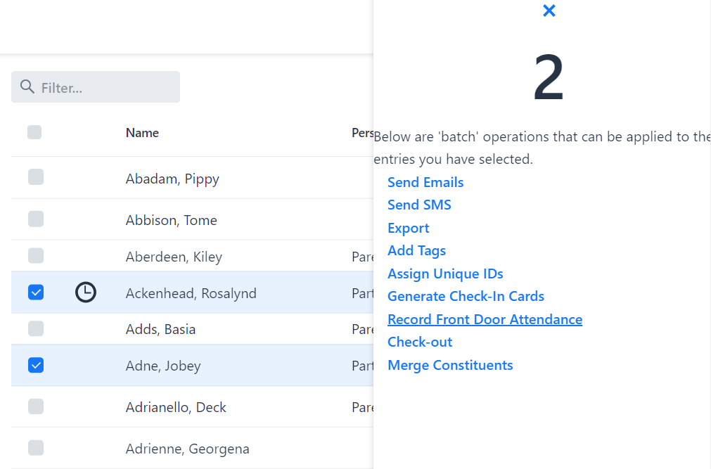 After selecting the desired constituents, you will find the "Record Front Door Attendance" option in the batch action sidebar. Click on this option to initiate the bulk attendance recording process.