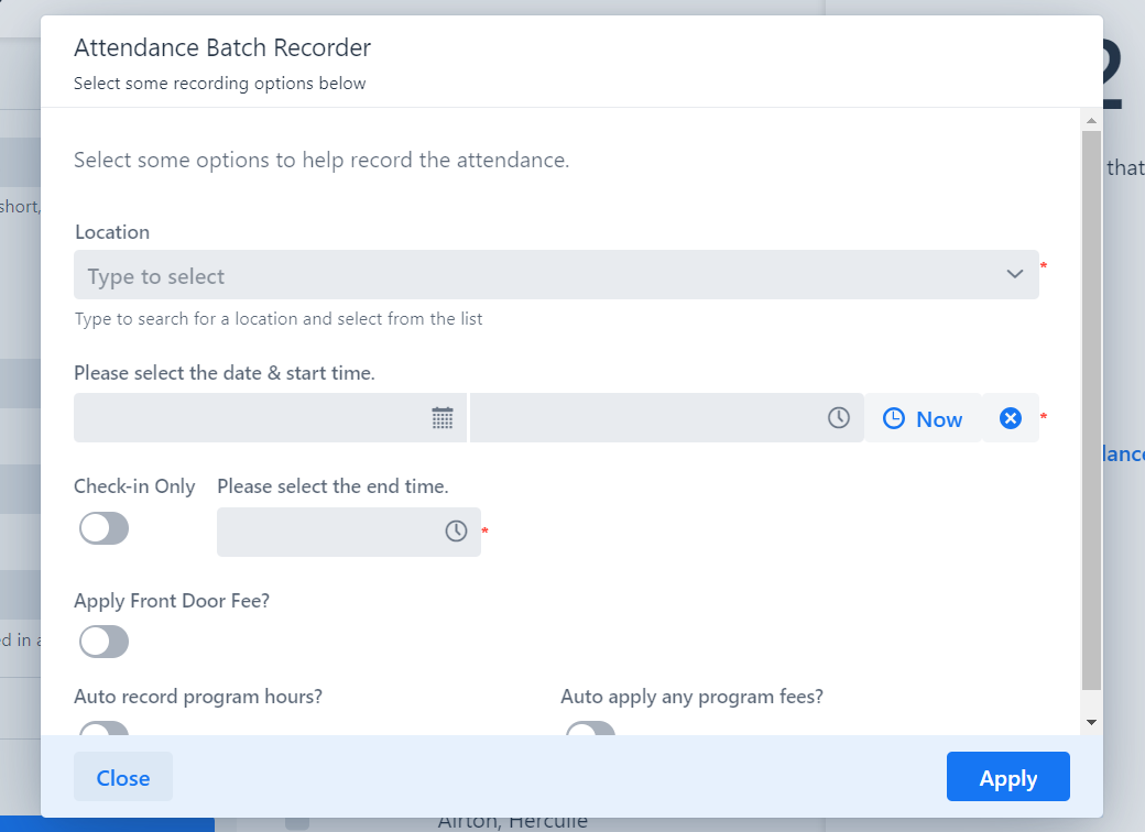 1. Set the location or center for which you are recording the attendance.
