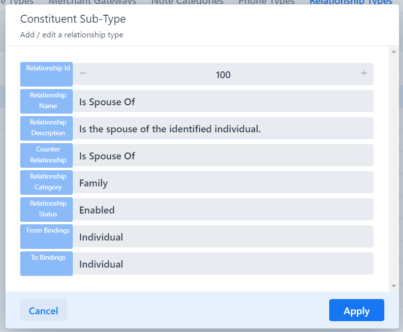 By managing relationship types in the SiteSetup Module, you can customize and tailor the available relationship options to fit the specific needs and context of your organization and the unique families you serve.