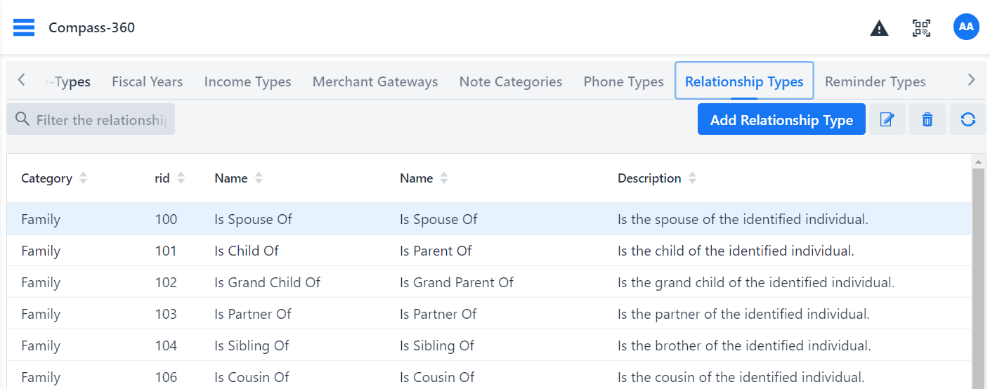 To add a new relationship type, click on the "Add Relationship Type" button located in the top right corner of the page.