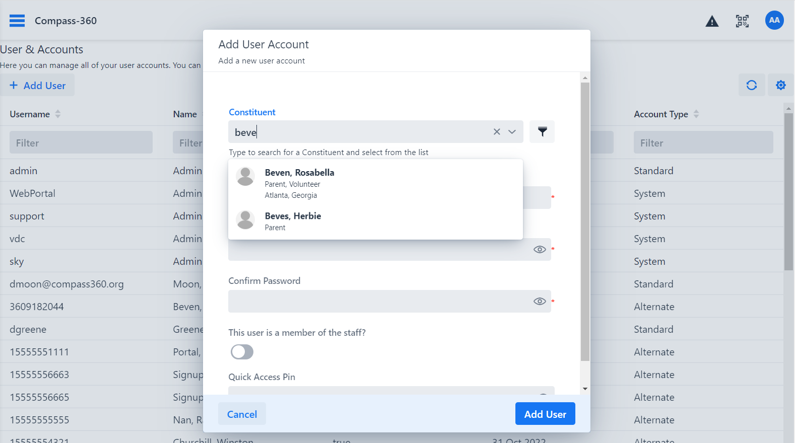 Next, set the User Account Type. Unless instructed otherwise by the C360 support team, choose "Standard." A username will be automatically generated based on the constituent's name, but you are free to modify it if desired.