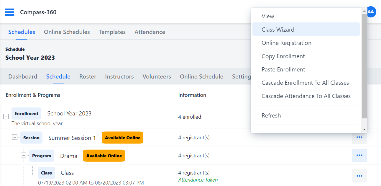 Class Wizard: Click on the "more" button next to the program, and then select "Class Wizard." Note that classes can only be added to a program.