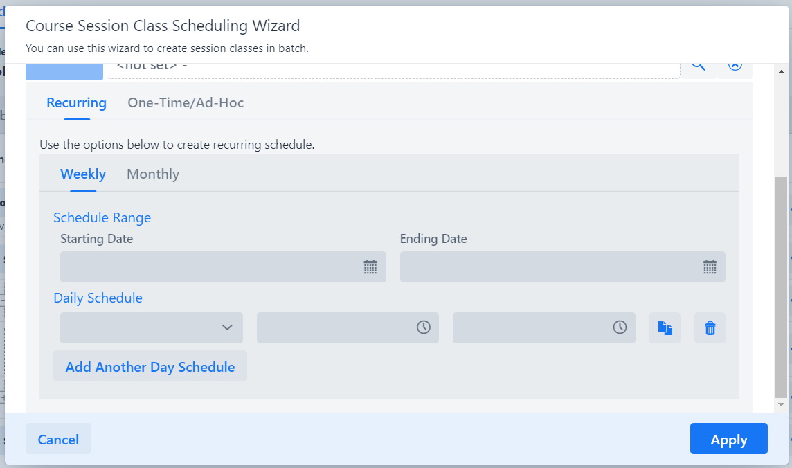 Weekly: If the classes occur on the same day of the week at the same time, use the weekly option. Select the start date and choose the days of the week the classes will occur on. You can also specify the end date for the classes.