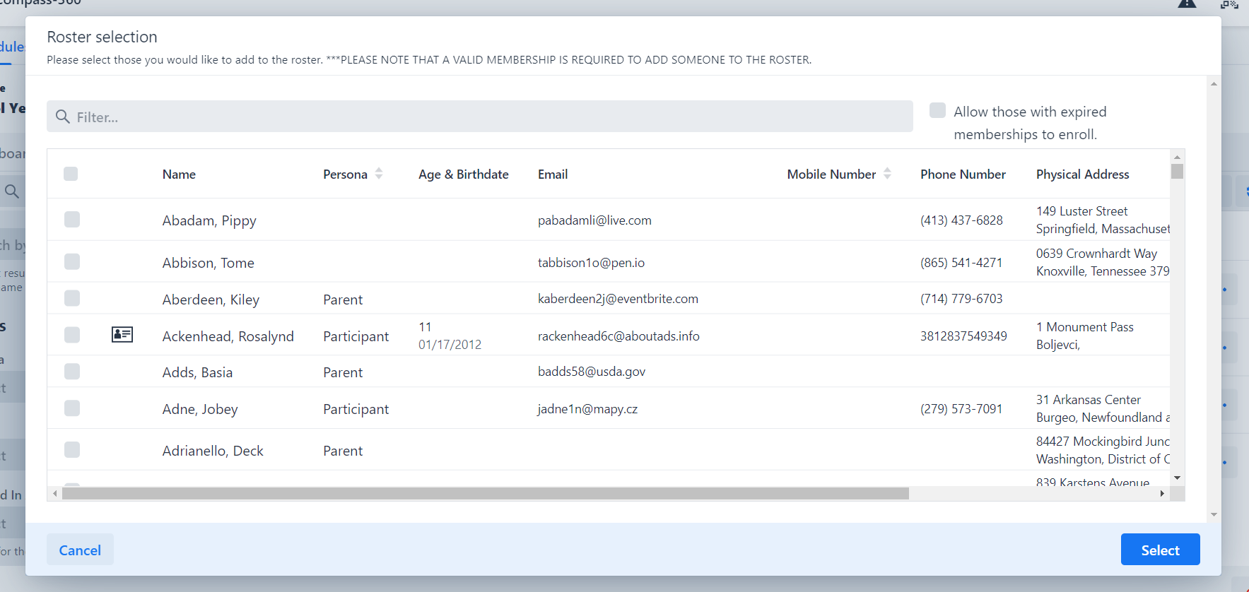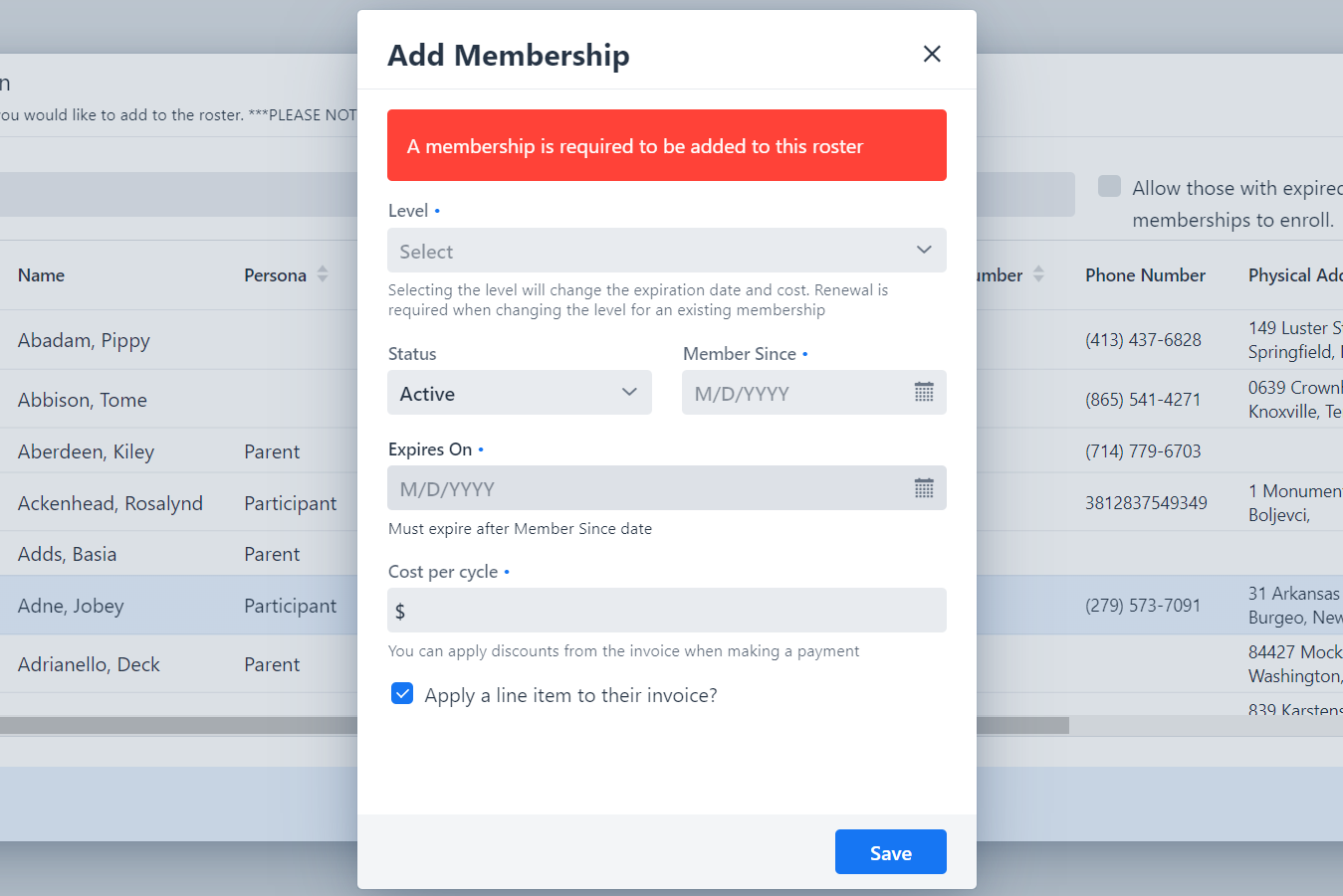 Use the search filter to pull a list of Participants you would like to add to the primary roster. You can use the various search parameters to narrow down the results, like searching for all Participants with an particular membership.