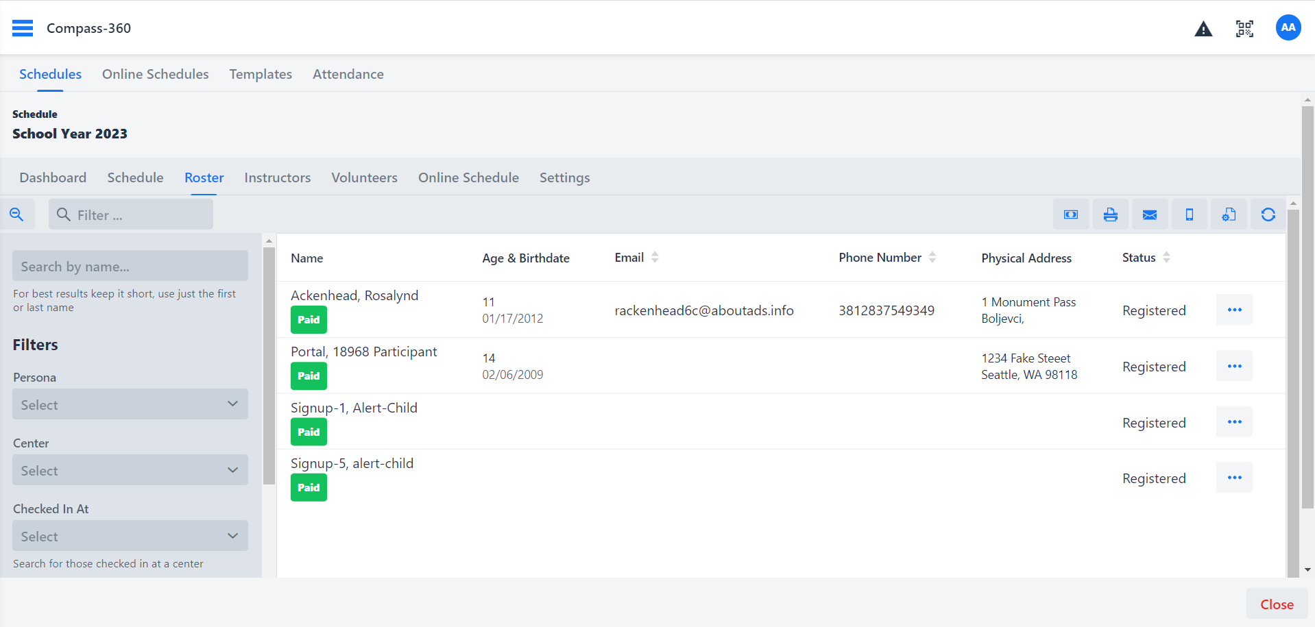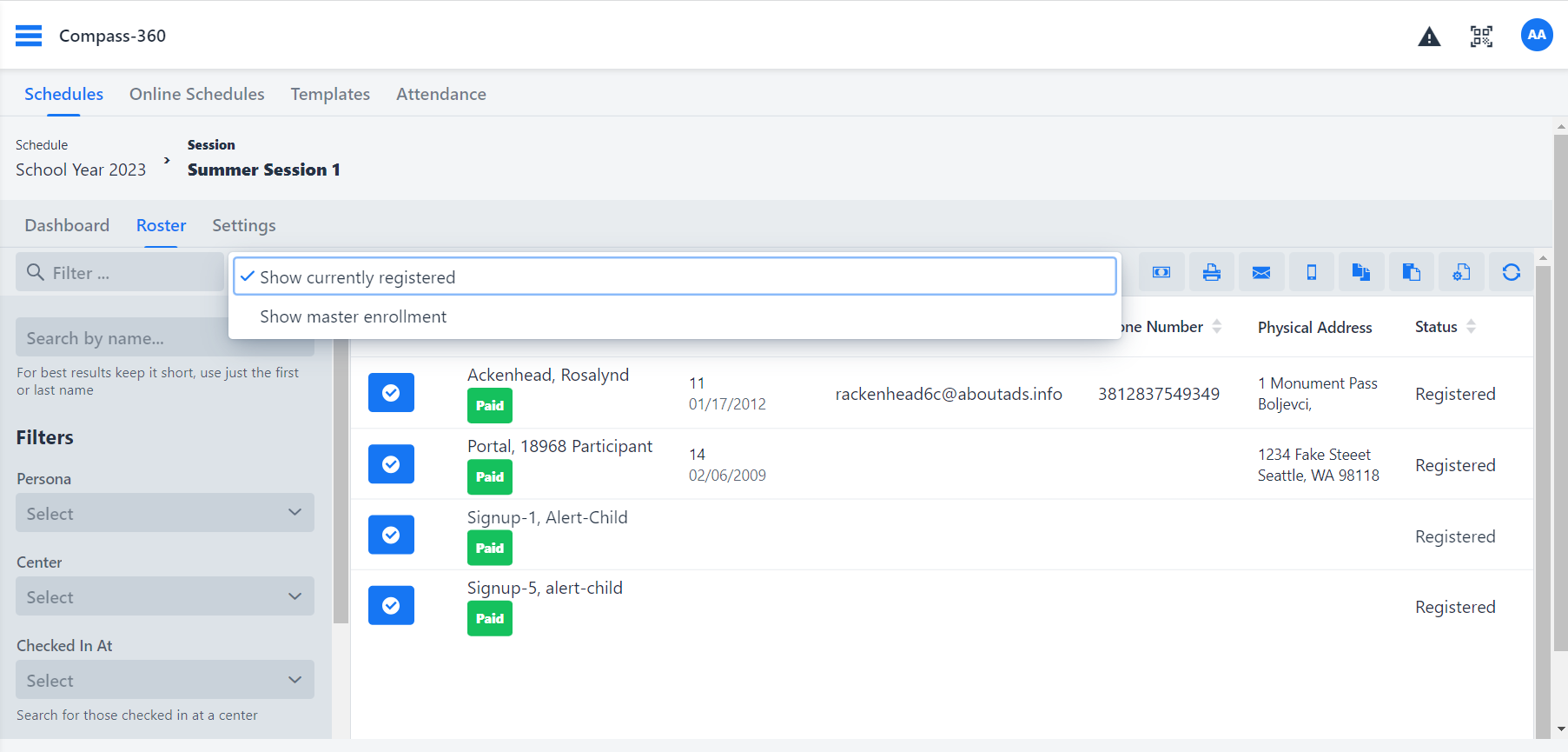 At the highest level of your Schedule, you have a primary Schedule roster, which acts as the central list of Participants for the entire Schedule. This primary roster serves as the single source of Participants for every level, including Sessions, Programs, and Classes. Before a Participant can be enrolled in any of these individual levels, they must first be added to the primary roster.